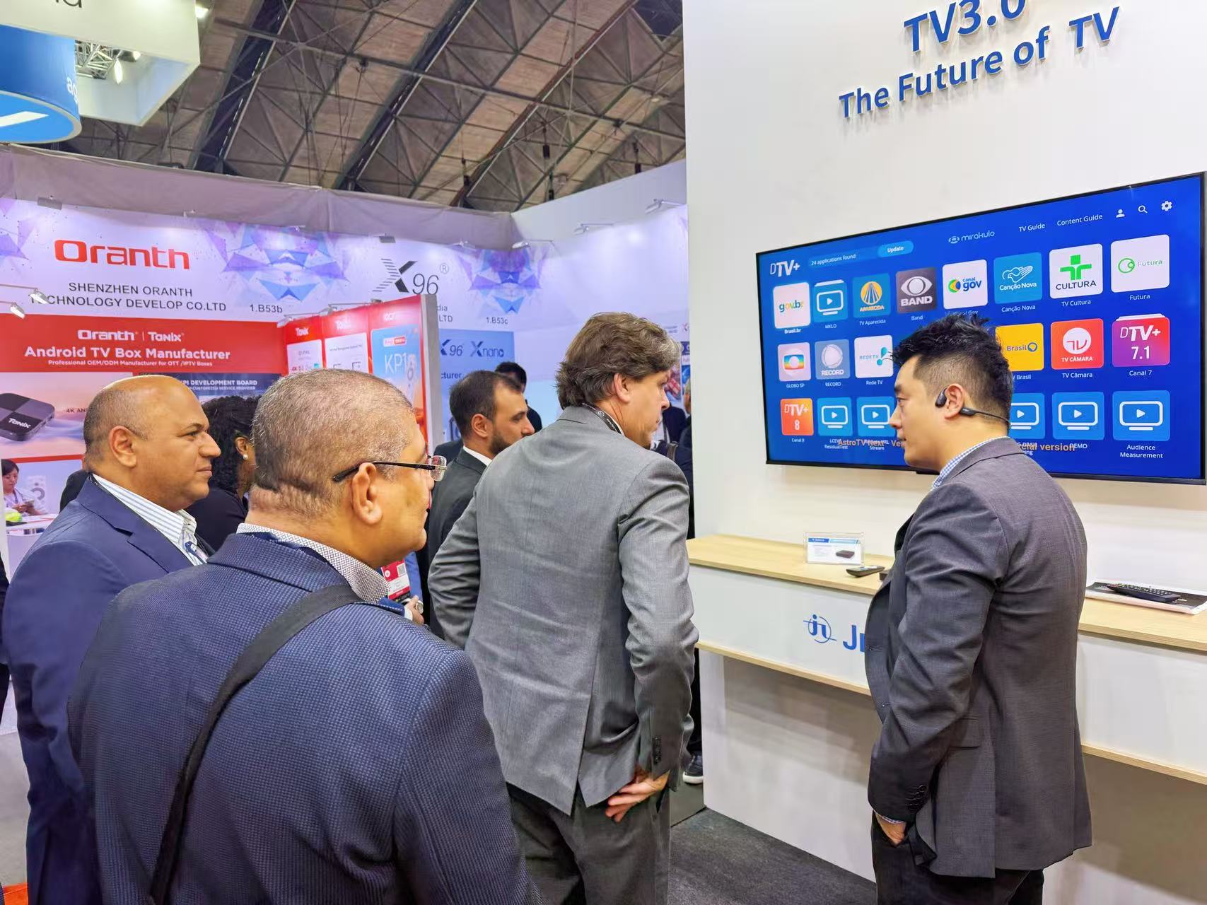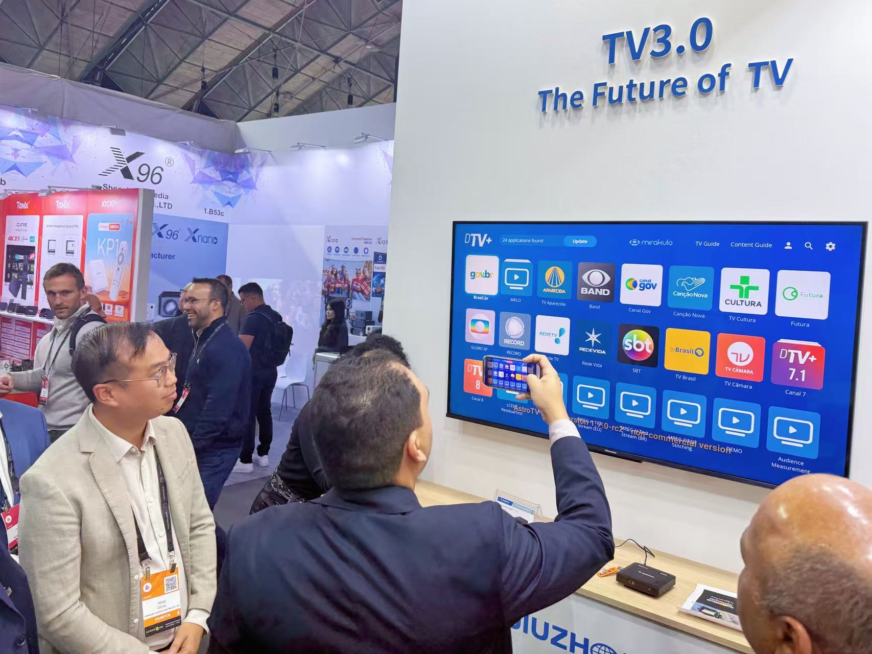 與此同時(shí),最新研發(fā)的巴西下一代數(shù)字電視標(biāo)準(zhǔn)TV 3.0機(jī)頂盒引發(fā)高度關(guān)注 — 巴西通信部部長Frederico de Siqueira Filho駐足九洲展位,認(rèn)真聆聽海外銷售團(tuán)隊(duì)對該產(chǎn)品的講解。該產(chǎn)品憑借 “多標(biāo)準(zhǔn)兼容 + 超高清體驗(yàn) + 場景適配” 的核心優(yōu)勢脫穎而出:一方面解決了不同區(qū)域信號接收的適配難題;另一方面搭載 Andriod 4K 系統(tǒng),以超高清音畫技術(shù)精準(zhǔn)還原細(xì)膩光影細(xì)節(jié)與立體聲音效,再結(jié)合多元內(nèi)容池的資源支撐,可靈活滿足家庭集體觀影、個(gè)人碎片化追劇等多樣化需求,成為本次展會中體現(xiàn) “技術(shù)適配性 + 用戶體驗(yàn)感” 的代表性產(chǎn)品。