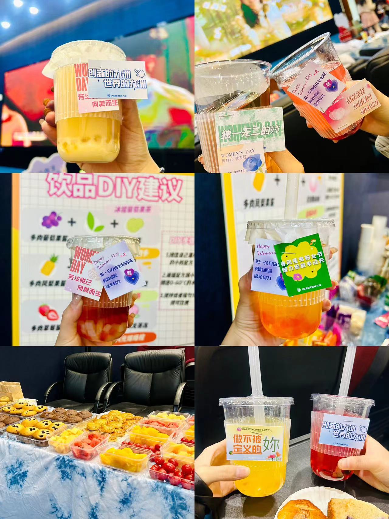公司為大家準備了果醬、茶底、小料、水果等幾十種豐富的飲品制作材料,大家對配料比例、調(diào)味選擇、色彩搭配和外部包裝等方面進行創(chuàng)意設(shè)計來調(diào)制飲品。不一會兒一杯杯色彩繽紛、果香四溢、造型各式的專屬飲品制作完成,大家都沉浸在自己發(fā)揮想象、親自動手制作飲品的幸福感和滿足感中。