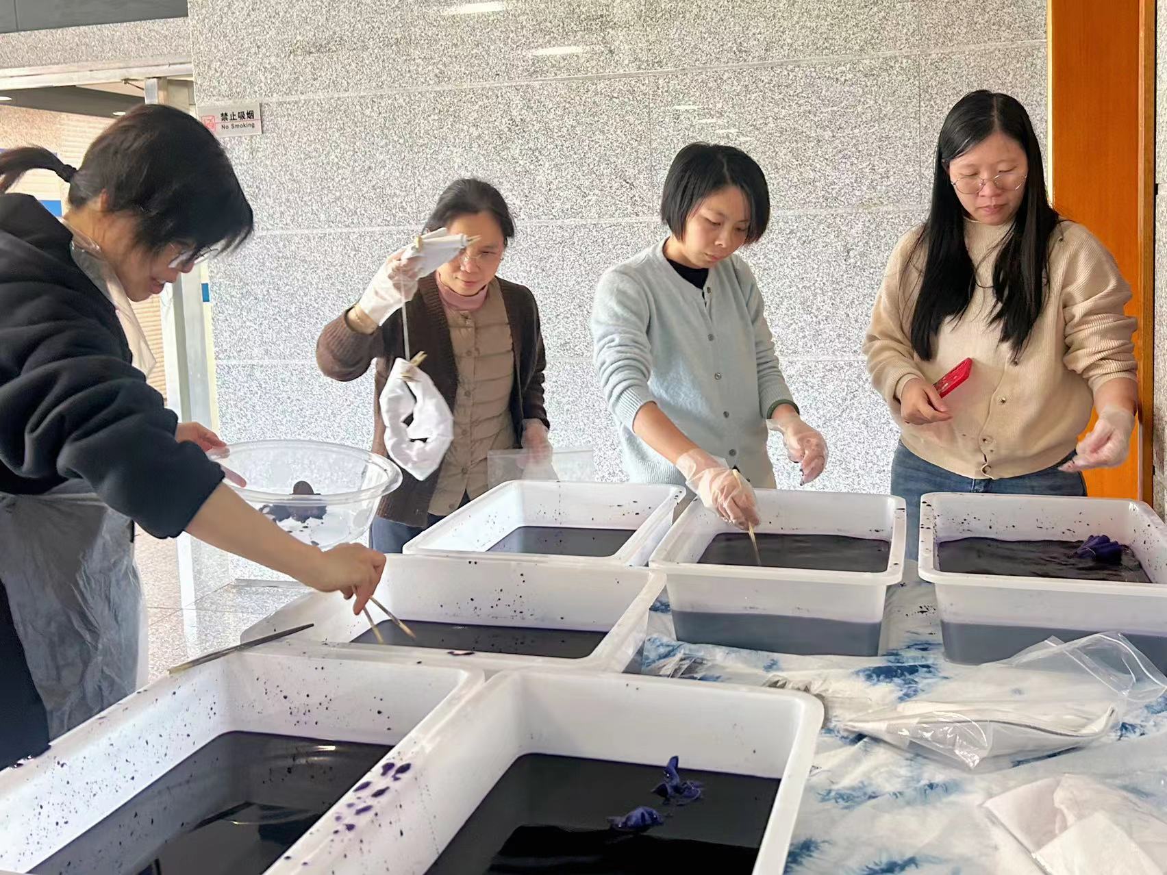 “巧手扎錦繡,靛藍染繁花”,扎染活動進入正題,大家先對扎染的歷史淵源、發(fā)展脈絡(luò)、制造技藝有了深入了解,并通過一系列風格迥異的扎染藝術(shù)作品,激發(fā)了濃厚的創(chuàng)作熱情。隨后,大家通過夾扎法和捆扎法,發(fā)揮想象力和創(chuàng)造力,親自設(shè)計、結(jié)扎并染色,制作出獨具特色的扎染作品。