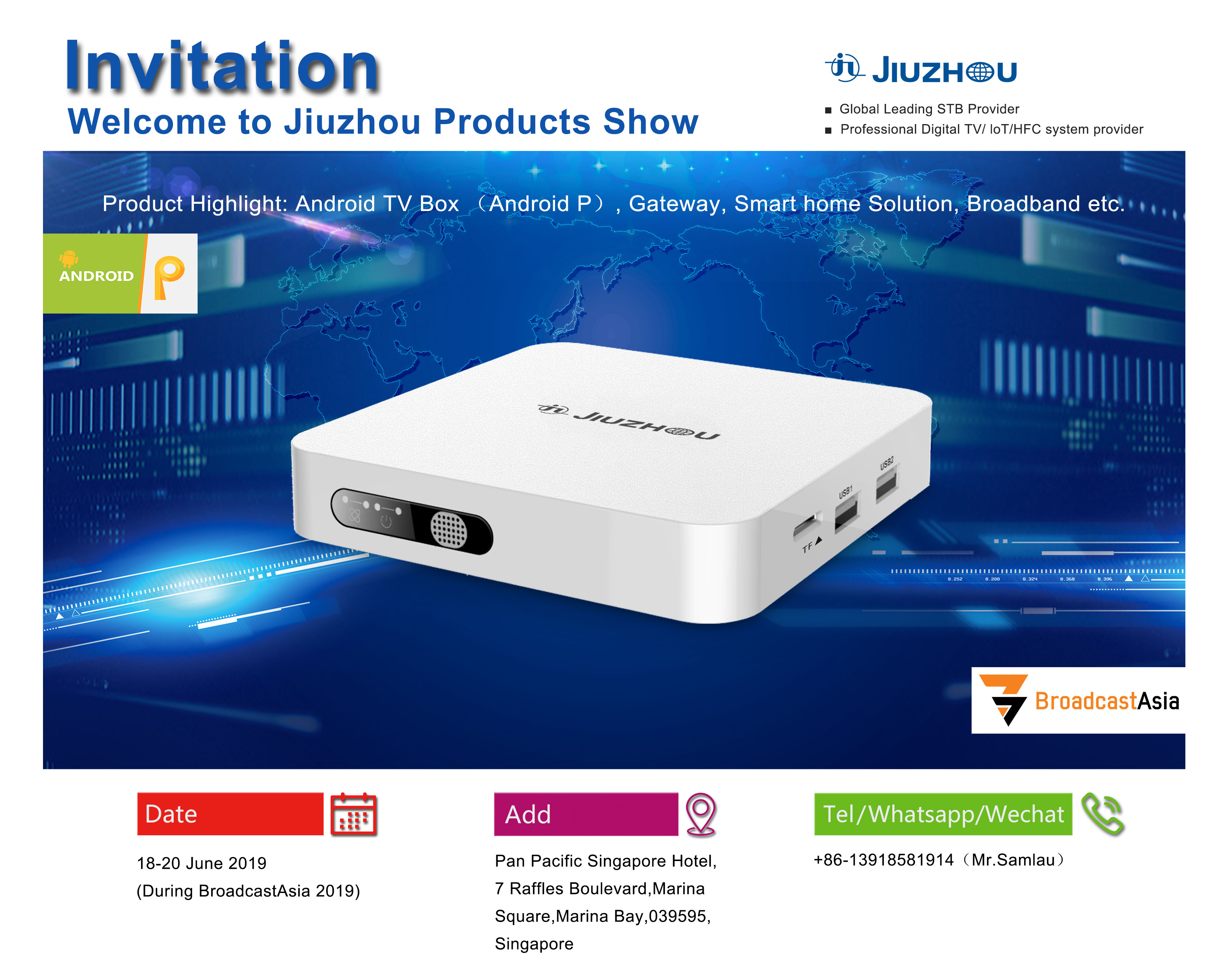 深圳市九洲電器有限公司產(chǎn)品推介會將于2019年6月18-20日在新加坡泛太平洋酒店舉行。本次產(chǎn)品推介會將重點(diǎn)推出Android TV Box (Android P), Gateway, Smart home Solution, Broadband等產(chǎn)品,歡迎各界人士蒞臨洽談!