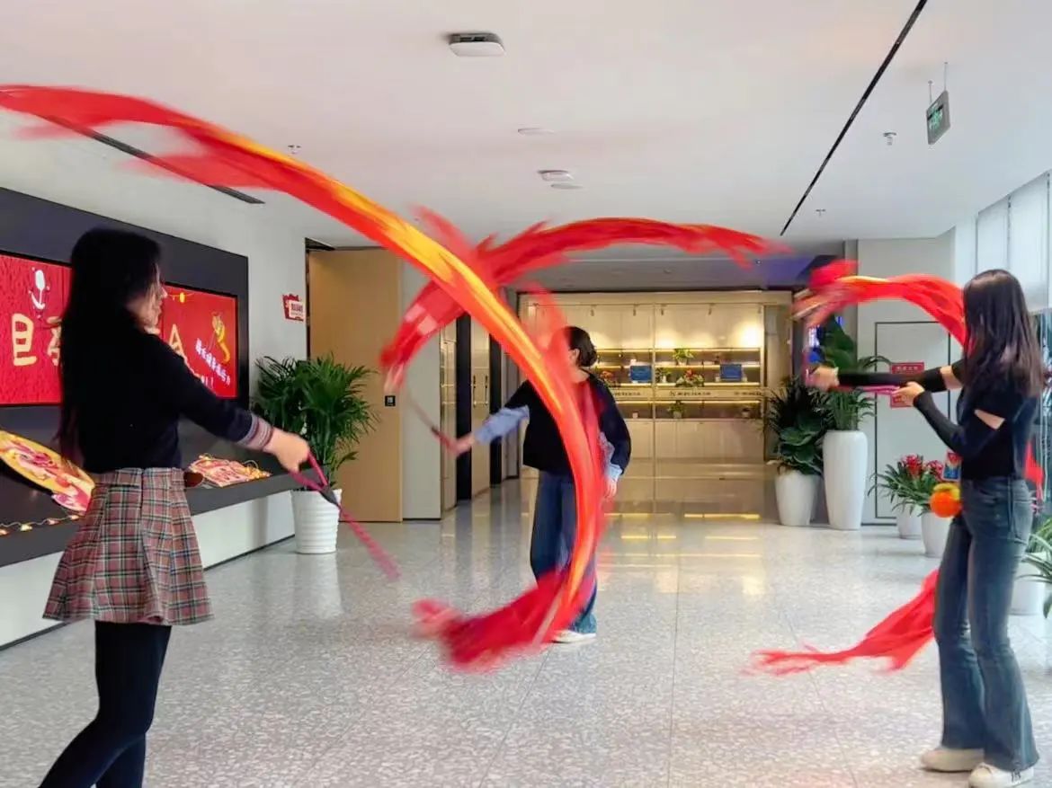 同事們有力地揮動手中的短繩,龍頭彩帶飄逸靈動,讓一條條“游龍”在空中飛舞。