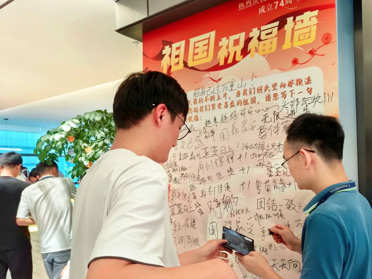 同事們在祖國祝福墻提筆寫下對祖國的美好祝愿或?qū)ι畹拿篮迷妇?。一句句動人的祝福語,抒發(fā)了大家真摯的愛國之情。